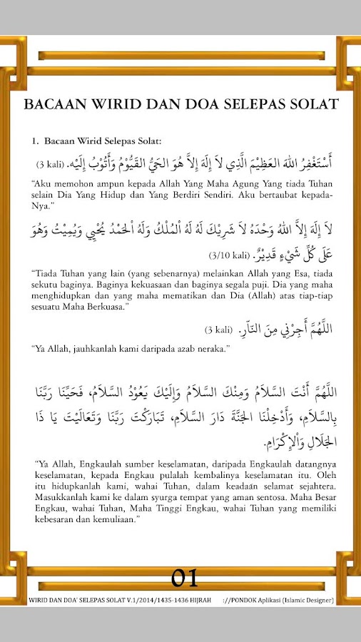 Wirid dan doa selepas solat ? Hadith yang diriwayatkan oleh imam muslim rahimahullah dari abu hurairah ra dariapada rasulullah saw yang bermaksud:sesiapa yang mengucapkan tasbih. Sangat dianjurkan untuk kita semua, sesudah selesai sholat fardhu untuk membaca wirid dan dizkir yang kemudian dilanjutkan dengan doa setelah sholat. Hopefully the wirid and doa application (prayer) after this prayer can be used. Applikasi wirid dan do'a (doa) selepas solat ini adalah satu applikasi ringkas yang kami hasilkan sebagai rujukan mudah untuk amalan harian selepas solat fardhu.